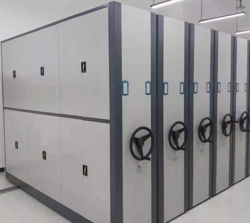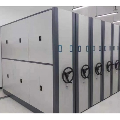 轨道的形成有埋入式和表露式两种,我们采用地面式两面加护坡式形式,两边的钢板表面,表面采用锈钢板装饰板,更加美观通行方便,轨道的底面我们使用120*1.2mm钢板以分散密集架对地面的承重。密集架整体颜色全为喷塑乳白色,边架装有整体闭合锁,门面装有扣手方形锁。