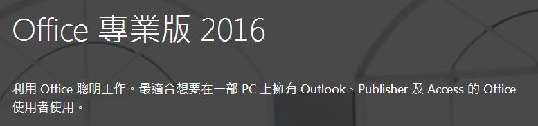 Word 2016、Excel 2016、PowerPoint 2016、OneNote 2016、Outlook 2016、Publisher 2016 和 Access 2016。