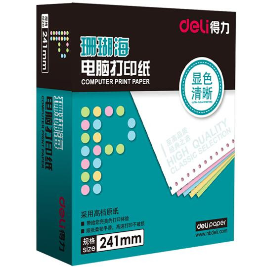 • 商品名称:得力(deli)珊瑚海彩色电脑打印纸S241-2CS两层整张80列(撕边色序:白红 1000页/箱)