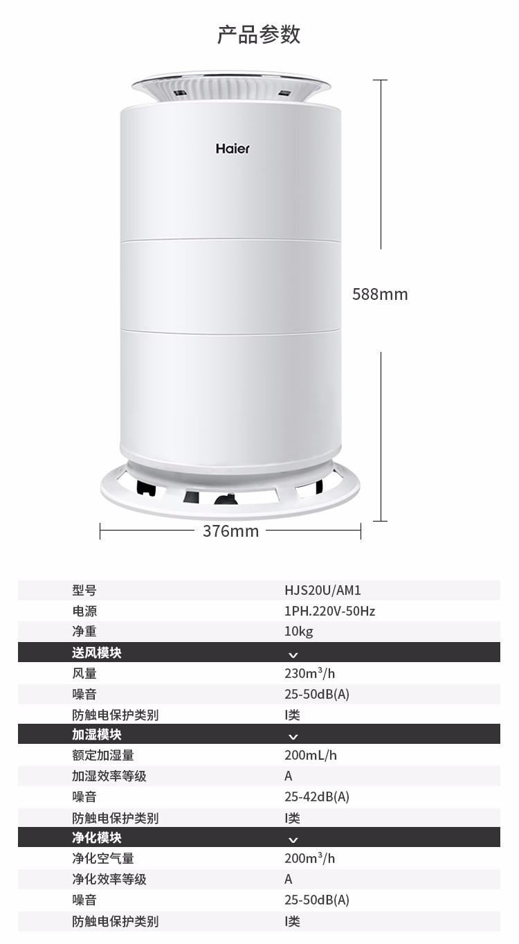 • 商品名称:Haier/海尔 空气类产品 HJS20U/AM1润爽系列整机