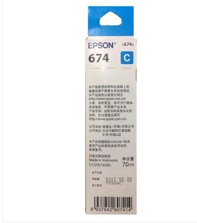 • 商品名称:爱普生(Epson)T6742青色墨水补充装T6742(适用于L801/L810/L850/L1800)