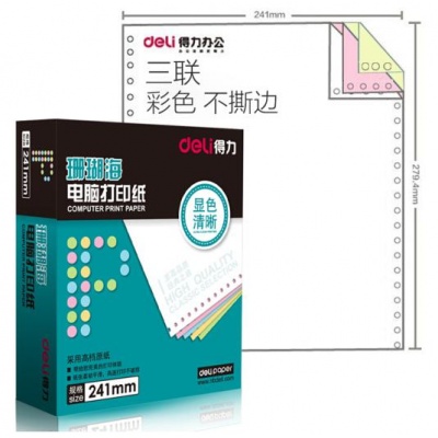 • 商品名称:得力(deli)珊瑚海彩色电脑打印纸S241-3C三层整张80列(不撕边 色序:白红黄 1000页/箱)