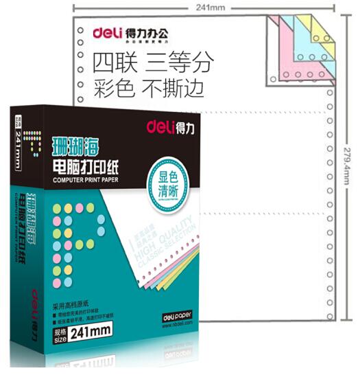 • 商品名称:得力(deli)珊瑚海彩色电脑打印纸S241-4-1/3C四层三等分80列(不撕边 色序:白红蓝黄 1000页/箱)